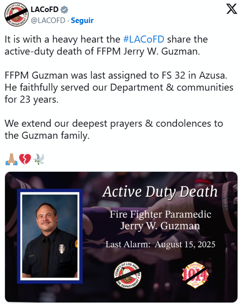 Con profundo pesar, el Departamento de Bomberos del Condado de Los Ángeles (LACoFD) informó este sábado el fallecimiento en servicio activo del bombero paramédico Jerry W. Guzmán, quien estaba asignado a la Estación 32 en Azusa.